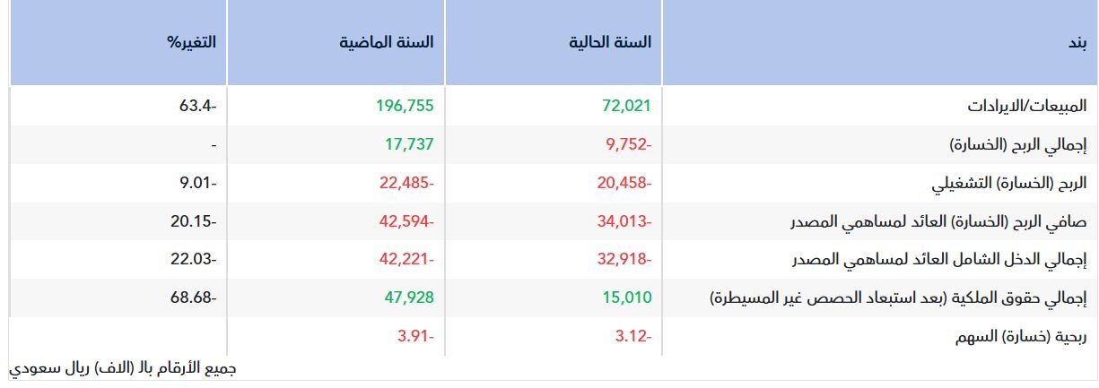 وأضافت أن الإيرادات تراجعت بنسبة 63.4% لتصل إلى 72.02 مليون ريال مقابل 196.7 مليون ريال في 2024.
