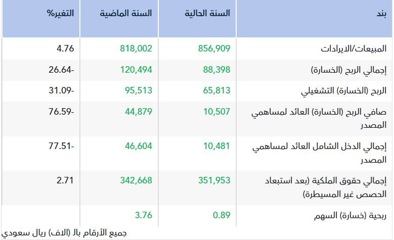 وارتفعت إيرادات الشركة بنسبة 4.76% في 2025 إلى 856.91 مليون ريال، مقابل 818 مليون ريال في العام 2024.