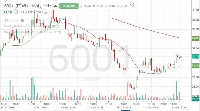 شهد سهم حلواني إخوان في شهر يناير عام 2026 ضغوطاً بيعية مع استمرار التداول دون المتوسطات المتحركة الرئيسية مما أدى لاختراق مستوى دعم رئيسي بالقرب من 30.80 ريال؛ ليظل السهم متداولاً ضمن اتجاه هابط ثانوي.