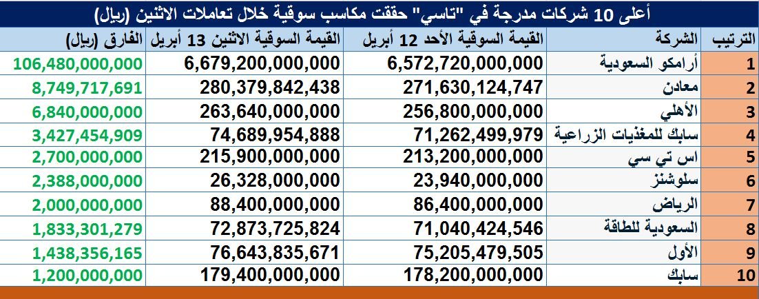 وحلت "معادن" في المرتبة الثانية بمكاسب بلغت 8.75 مليار ريال، تليها البنك "الأهلي" بواقع 6.84 مليار ريال، و"سابك للمغذيات الزراعية" بواقع 3.43 مليار ريال.