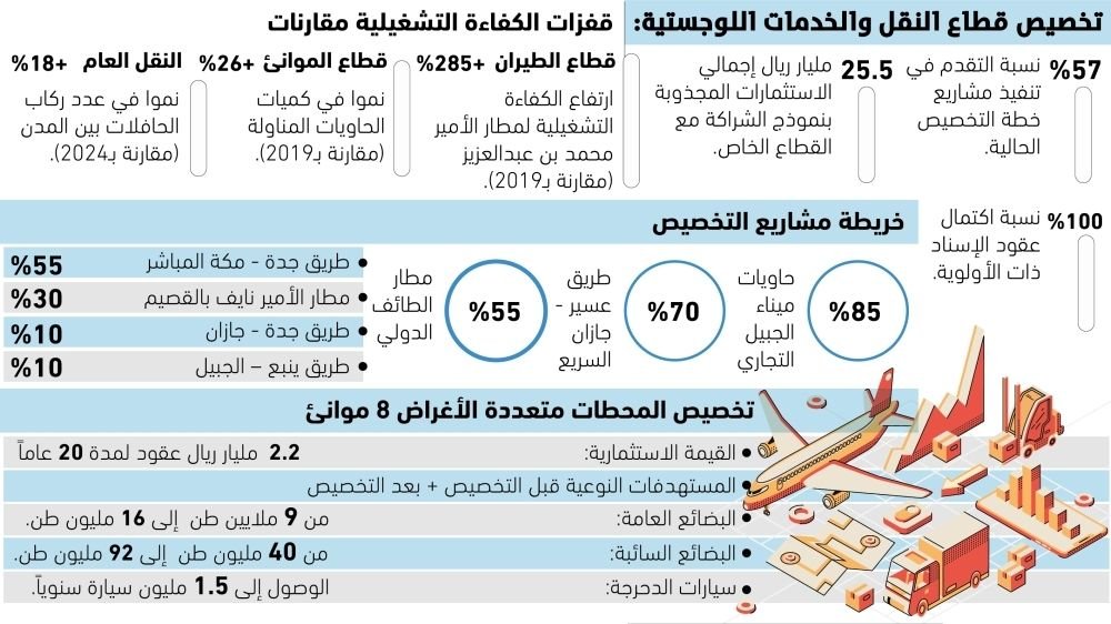 وبحسب تقرير وزارة النقل و الخدمات اللوجستية للعام المنصرم، فقد أسهمت جهود التخصيص في جذب استثمارات بقيمة 25.5 مليار ريال بنموذج الشراكة مع القطاع الخاص، ورفع الكفاءة التشغيلية وجودة الخدمات، الذي يتجلى ثماره في ارتفاع الكميات المناولة في محطات الحاويات بقطاع الموانئ بنسبة تتجاوز 26% خلال العام مقارنة مع خط الأساس 2019م، ونمو عدد الركاب لمشروع تحرير سوق نقل الركاب بالحافلات بين المدن في المملكة في قطاع النقل العام بنسبة تتجاوز 18% خلال العام مقارنة مع خط الأساس 2024م، إضافة إلى ارتفاع الكفاءة التشغيلية لمشروع تخصيص مطار الأمير محمد بن عبدالعزيز في المدينة المنورة في قطاع الطيران بنسبة تتجاوز 285% خلال عام 2025م مقارنة مع عام 2019م.