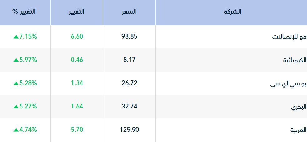 وعلى صعيد أداء الأسهم، هيمن الارتفاع على أداء 147 سهماً، تصدرها سهم "قو للاتصالات" بارتفاع نسبته 7.15%، تلاه سهم "الكيميائية" بنسبة بلغت 5.97%.