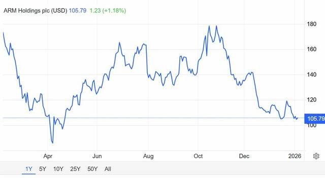 استهل سهم ARM عام 2025 بأداء إيجابي قوي خلال شهر يناير، حيث ارتفع السعر من مستوى 129 إلى 182.90 دولار، إلا أن السهم تعرض لاحقًا لضغوط بيعية قوية خلال الفترة الممتدة من شهر فبراير وحتى شهر أبريل، ليتراجع إلى قاع سعري عند مستوى 80 دولار.