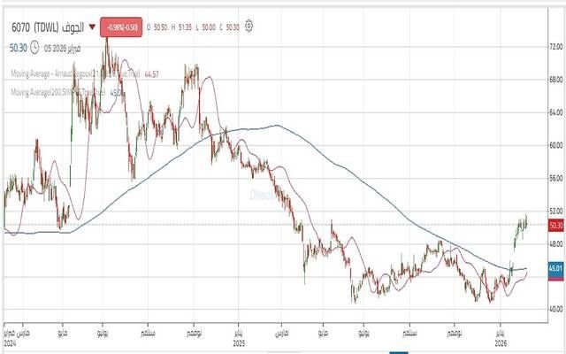 ويختبر السعر حالياً مقاومة مهمة حول 51.00 ريال، ويؤيد ثبات السعر أعلى المستوى فرص الصعود نحو 52.40 ريال، يليه مستوى 53.40 ريال، وإذا تجاوز المستوى يرجح امتداد الحركة الصاعدة نحو 56.00 ريال، بينما الثبات دون مستوى دعم 49.95 ريال يهدد فرص الصعود على المدى القصير.