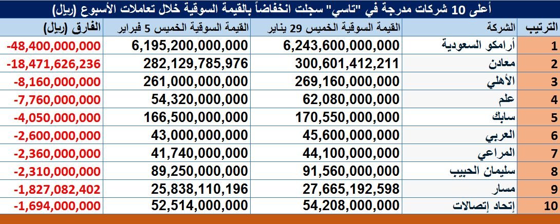 وسجلت "أرامكو السعودية" أعلى تراجع في القيمة السوقية خلال تعاملات هذا الأسبوع؛ بواقع 48.4 مليار ريال، يليها "معادن" بانخفاض يقدر بـ 18.47 مليار ريال، ثم "الأهلي" بـ 8.16 مليار ريال.