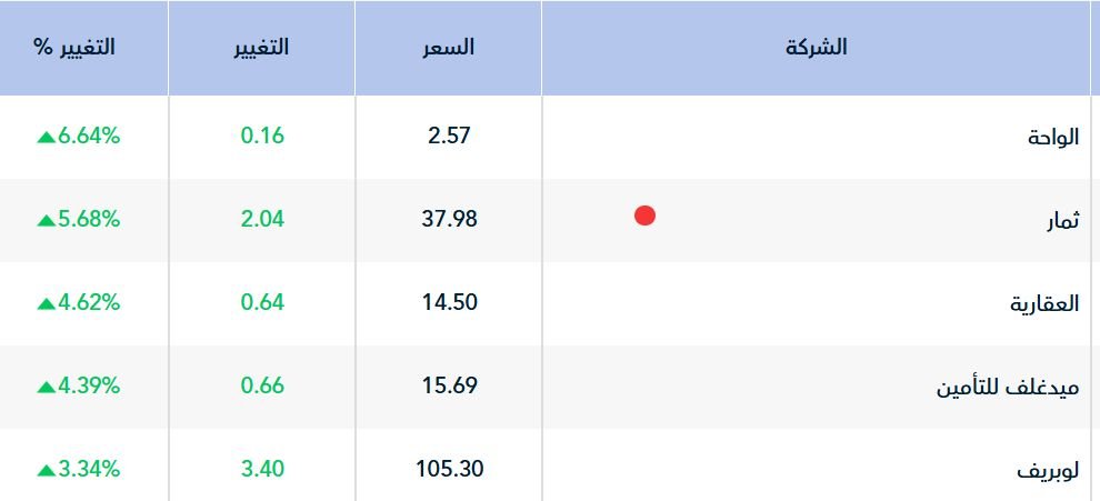 وعلى صعيد أداء الأسهم، هيمن الارتفاع على أداء 178سهماً، تصدرها سهم "الواحة " بارتفاع نسبته 6.64%، تلاه سهم "ثمار" بنسبة بلغت 5.68%.