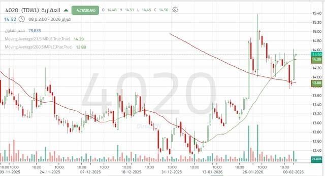 ملخص حركة السعر: بدأ سهم العقارية عام 2025، بتداولات عند مستويات مرتفعة نسبياً، إلا أنه سرعان ما شكّل قمماً هابطة اعتباراً من شهر فبراير ليستمر الاتجاه الهابط حتى شهر ديسمبر. ومع بداية عام 2026، أظهر السهم إشارات إيجابية بالارتداد من منطقة طلب قوية حول 12.30 ريال، مصحوبة بأحجام تداول مرتفعة واختراق مقاومات فنية هامة.