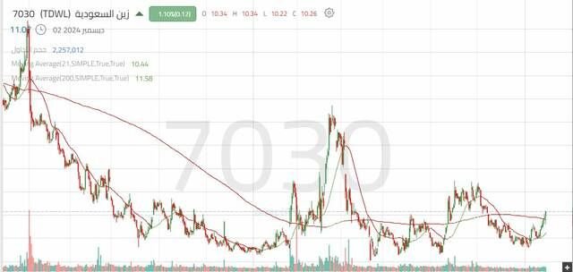 ثم شهد السهم بعد ذلك، التراجع نتيجة ضغط بيعي واضح بدأ من شهر مايو حتى يونيو، حيث بلغ السهم قاعه عند مستوي 10 ريال ودخل السهم في حالة من التذبذب والاتجاه العرضي امتد من يونيو حتى سبتمبر، ونجح السهم مؤخرًا في شهر يناير من عام 2026 بإظهار هيكلية صاعدة متجاوزًا النطاق العرضي.