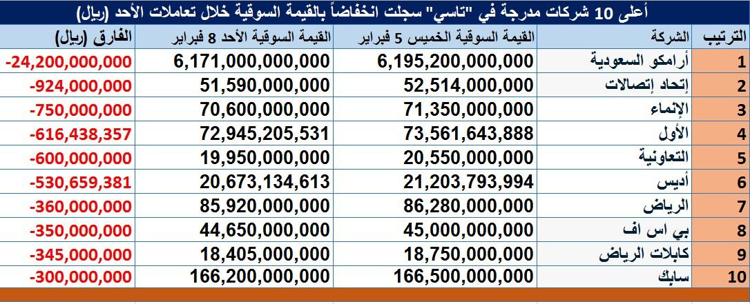 وسجلت "أرامكو السعودية" أكبر تراجع في القيمة السوقية بنهاية تعاملات اليوم؛ بانخفاض نسبته 24.2 مليار ريال، يليها "موبايلي" بتراجع يقدر بـ 924 مليون ريال، ثم مصرف "الإنماء" بانخفاض يبلغ 750 مليون ريال.