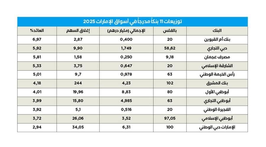 أعلن 11 بنكاً مدرجاً في أسواق الإمارات المالية، توزيعاتها النقدية لعام 2025، وجاءت العوائد متفاوتة، لتراوح بين 2.94% و6.97%، وفقاً لإغلاق 6 فبراير 2026.