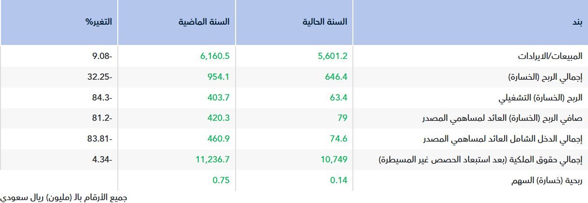 وأضافت الشركة فى بيان على "تداول" اليوم الاثنين، أن صافي الربح العائد لمساهمي الشركة انخفض إلى 79 مليون ريال، مقابل 420.3 مليون ريال في العام السابق.