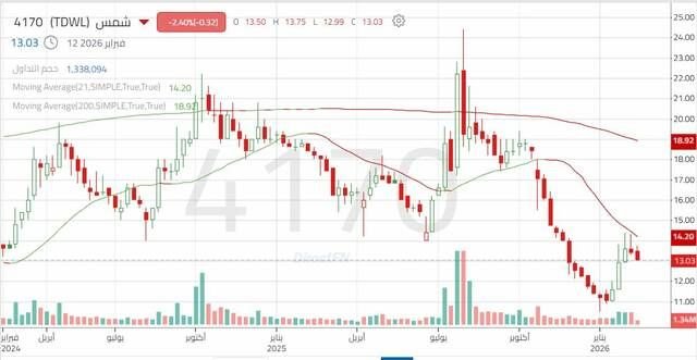 ملخص حركة السعر: شهد سهم شمس تداولاته في يناير 2025 بحركة عرضية ومرحلة تجميع مع ضعف ملحوظ في أحجام التداول، إلا أنه سرعان ما كوَّن قممًا أقل ليستأنف الاتجاه الهابط الرئيسي من شهر فبراير حتى شهر يونيو. ثم نجح في الصعود في شهر يوليو، ولكن لم تكن القوة الشرائية قادرة على إكمال الاتجاه، حيث ظهر ضغط بيعي قوي من شهر أغسطس حتى شهر ديسمبر. وبدايةً من عام 2026 نجح السعر في الارتداد من مستوى دعم هام مع أحجام تداول مرتفعة.