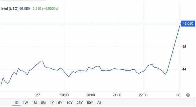 السهم تحت الأضواء بعد قيام المدير المالي بشراء أسهم في الشركة، وقد تستخدم إنفيديا إنتل في جزء من إنتاجها لعام 2028.