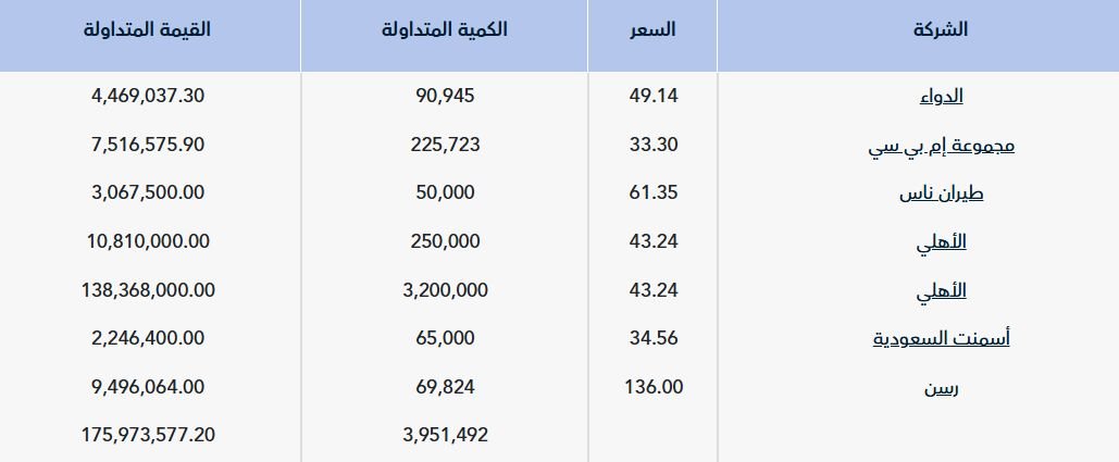 وشهد سهم "أسمنت السعودية" تنفيذ صفقة خاصة بقيمة 2.25 مليون ريال، من خلال 65 ألف سهم عند سعر 34.56ريال، بالإضافة إلى صفقة خاصة على سهم "أم بي سي" بقيمة 7.51 مليون ريال، من خلال 225.723 ألف سهم، عند سعر 33.30 ريال.
