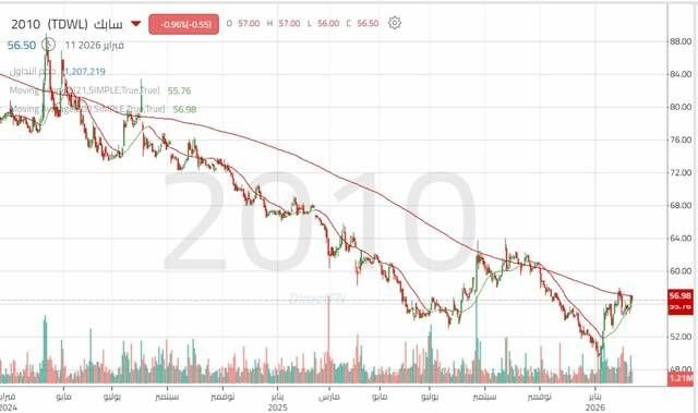 ولاستكمال الموجة الصاعدة، يُشترط ثبات السهم أعلى مستوى المقاومة 57.90 ريال، قد يرجح امتداد الحركة الصاعدة نحو 59.20 ريال - 59.50 ريال، تجاوز المستوى يدفع السعر نحو 60.90 ريال.