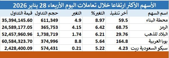 وفي المقابل، تصدر سهم "سي جي إس" الأسهم الأكثر انخفاضا ، حيث تراجع بنسبة 4.27% ليغلق بتعاملات اليوم عند مستوى 10.10 ريالا، وتلاه سهم "الأصيل" بنسبة 4.01% مغلقا عند مستوى 3.83 ريال.