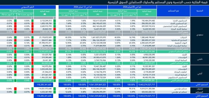 الرياض - مباشر: ارتفعت قيمة الأسهم المملوكة للأجانب بسوق الأسهم السعودية "تداول"، خلال الأسبوع الماضي المنتهي بتاريخ 12 فبراير 2026، مقارنةً بالأسبوع السابق.