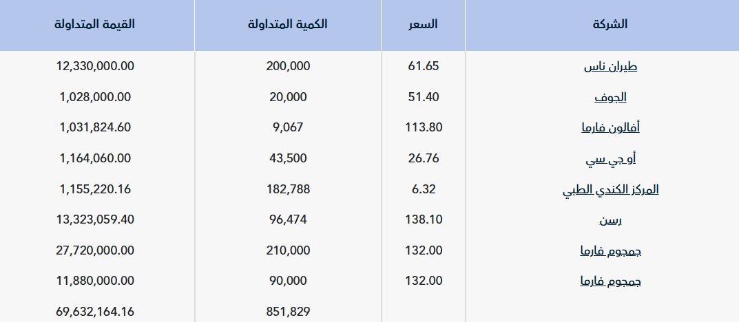 كما تم تنفيذ صفقة على سهم "طيران ناس" بقيمة 12.33 مليون ريال، عند سعر 61.65ريال، بكمية بلغت 200 ألف سهم.