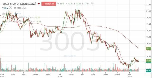 استهل سهم أسمنت المدينة تداولاته خلال الربع الأول من عام 2025 بالقرب من مستوى 17.45 ريال، وسجل ارتفاعًا ملحوظًا حتى وصل إلى 21.05 ريال، ثم تعرض لضغوط بيعية من شهر أبريل حتى شهر ديسمبر، حيث بلغ السعر قاعًا عند 12.10 ريال، ونجح السعر في الارتداد في بداية عام 2026 مخترقًا مقاومة هامة، مما يعزز فرص الصعود على المدى القصير، ولكن ما زال الاتجاه العام للسهم هابطًا.