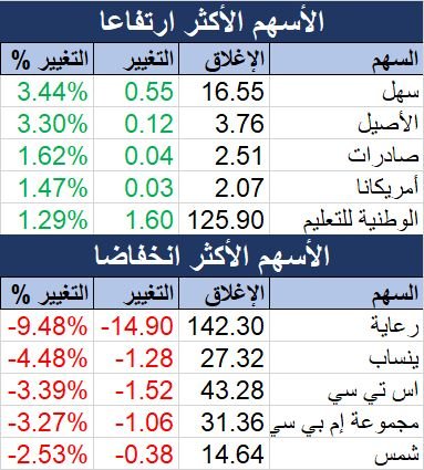 وشهد 75 سهماً أداءً إيجابيا، بصدارة سهم "سهل" الذي صعد 3.44%، تلاه سهم "الأصيل" بارتفاع نسبته 3.3%.