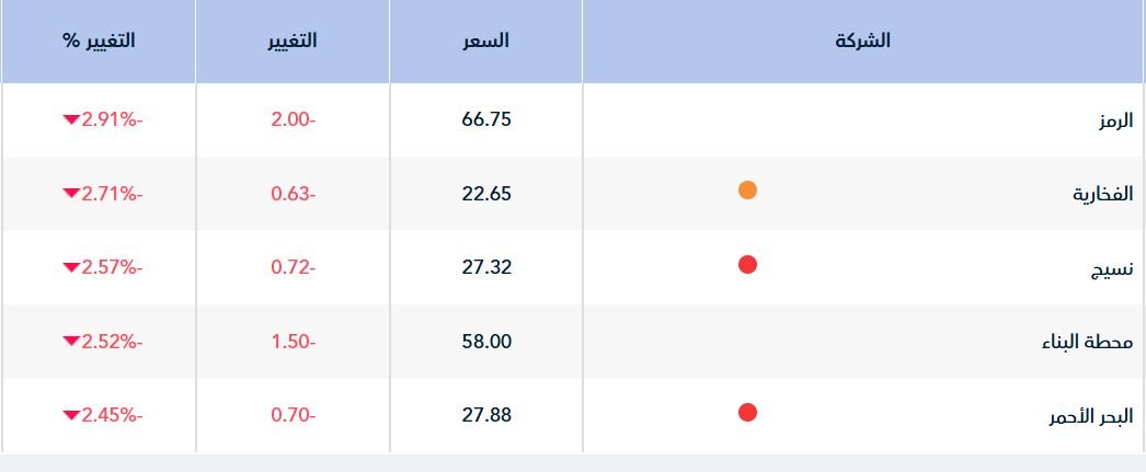 وهيمن التراجع على أداء224 سهما، تصدرها سهم "الزمر" بتراجع نسبته 2.91 %، تلاه سهم "الفخارية" بنسبة تراجع بلغت 2.71%.