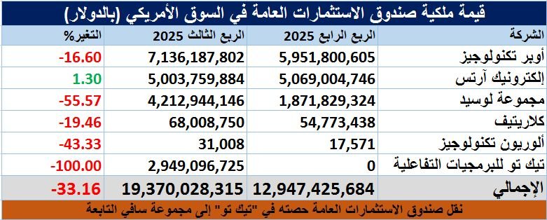 وتراجعت قيمة ملكية الصندوق السيادي السعودي في السوق الأمريكي بنسبة 33.16% خلال الربع الأخير من عام 2025م، مقارنة مع الربع السابق، بحسب إحصائية أعدها "معلومات مباشر" تستند لإفصاح للصندوق على هيئة الأوراق والبورصات الأمريكية.