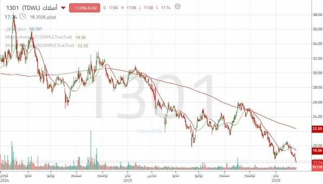 مباشر للأبحاث: يتعرض سهم شركة اتحاد مصانع الأسلاك "أسلاك" إلى ضغط بيعي واضح، حيث يتحرك السعر في اتجاه هابط رئيسي دون المتوسط المتحرك الذي يكون بمثابة مقاومة متحركة للسعر ودون خط اتجاه ذو زاوية حادة مما يشر إلى قوة الحركة الهابطة وهيمنة القوى البيعية وتسارعها.