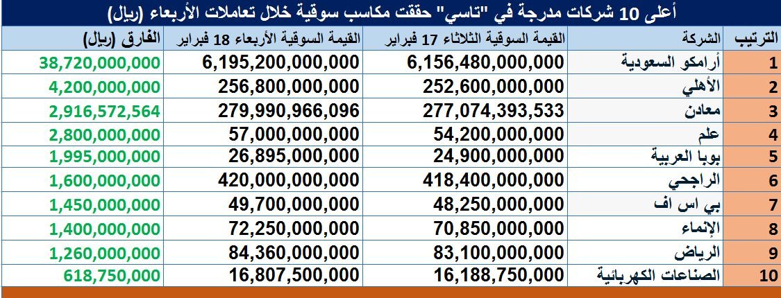 وحققت "أرامكو السعودية" أعلى زيادة في القيمة السوقية بنهاية جلسة اليوم الأربعاء؛ بواقع 37.72 مليار ريال، يلها البنك "الأهلي" بزيادة قيمتها 4.2 مليار ريال، ثم "معادن" بـ 2.92 مليار ريال.