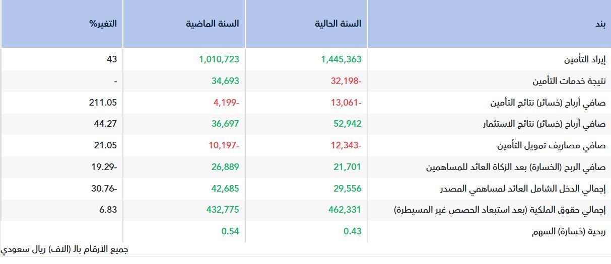 في المقابل، ارتفعت إيرادات التأمين بنسبة 43% خلال عام 2025 لتصل إلى 1.445 مليار ريال، مقارنة بـ1.011 مليار ريال في عام 2024.
