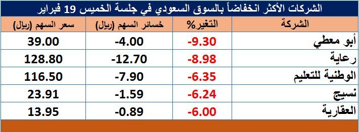 وتصدر سهم "أبو معطي" الأسهم الخاسرة في تعاملات اليوم؛ بتراجع نسبته 9.30%، ليغلق عند مستوى 39.0 ريال.