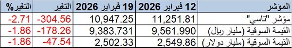 مباشر - ثابت شحاتة: شهد سوق الأسهم السعودية أداء سلبيا خلال الأسبوعي المنتهي في 19 فبراير 2026، في ظل هبوط شبه جماعي للقطاعات، وسط تراجع السيولة مقارنة بالأسبوع الماضي.