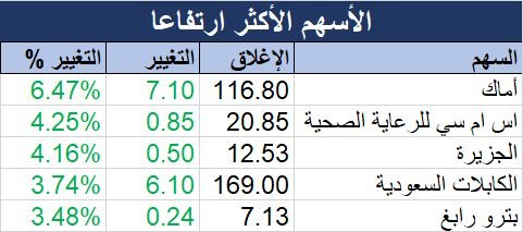 واقتصر اللون الأخضر على 31 سهما باللون الأخضر، تصدرها سهم "أماك" بارتفاع نسبته 6.47%، وكان المركز الثاني لسهم "اس ام سي للرعاية الصحية" الذي صعد 4.25%.