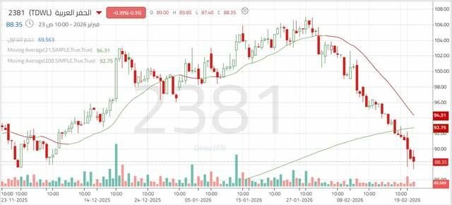 بدأ سهم الحفر العربية عام 2025 عند مستويات أقل مقارنةً بالعام السابق، وتعرض منذ بداية السنة لضغوط بيعية قوية تسببت في هبوطه من 110.70 ريال إلى 72 ريال من شهر يناير حتى يونيو، وبعد تكوين هذا القاع، انتقل السهم إلى مرحلة تذبذب ضمن نطاق عرضي بين 72 و92 ريالاً خلال الفترة من يونيو إلى أكتوبر. وفي نوفمبر، ظهرت بوادر تحسّن مع دخول زخم شرائي جديد، في محاولة من السهم للتعافي وتعويض جزء من تراجعه واستمر الاتجاه الثانوي الصاعد حتى شهر يناير عام 2026. وبدأ السهم في معاودة الهبوط مرة أخرى في شهر فبراير.