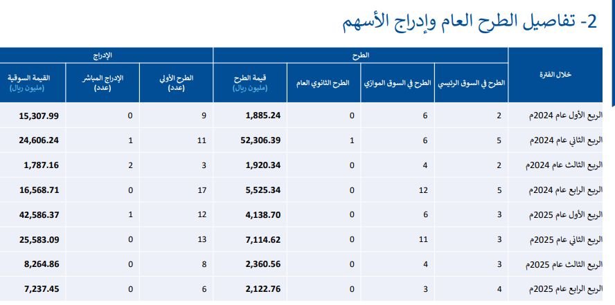 وبلغ عدد الشركات الجديدة المدرجة في سوق الأسهم (الرئيسي والموازي) 6 شركات بالربع الرابع من عام 2025م، وبلغت قيمتها السوقية 7.24 مليار ريال، فيما شهد السوق 7 طروحات بواقع 4 طروحات في السوق الرئيسية و3 طروحات في السوق الموازية، حيث بلغت قيمة الطرح الأولى لتلك الشركات 2.12 مليار ريال.