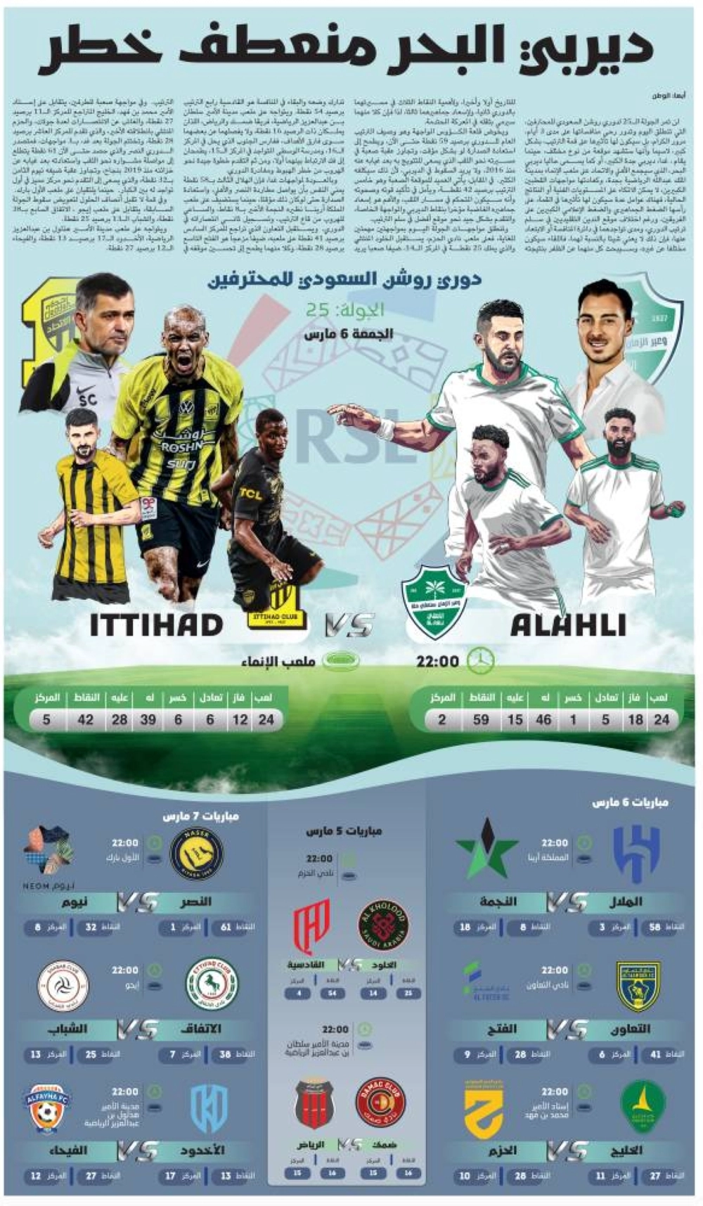وبالعودة لمواجهات غدا، فإن الهلال الثالث بـ58 نقطة يمني النفس بأن يواصل مطاردة النصر والأهلي، واستعادة الصدارة حتى لوكان ذلك مؤقتا، حينما يستضيف على ملعب المملكة آرينا نظيره النجمة الأخير بـ8 نقاط، والساعي للهروب من قاع الترتيب، وتسجيل ثاني انتصاراته في الدوري. ويستقبل التعاون الذي تراجع للمركز السادس برصيد 41 نقطة على ملعبه، ضيفا مزعجا هو الفتح التاسع برصيد 28 نقطة، وكلا منهما يطمح إلى تحسين موقفه في الترتيب. وفي مواجهة صعبة للطرفين، يتقابل على إستاد الأمير محمد بن فهد، الخليج المتراجع للمركز الـ11 برصيد 27 نقطة، والغائب عن الانتصارات لعدة جولات، والحزم المنتشي بانطلاقته الأخير، والذي تقدم للمركز العاشر برصيد 28 نقطة. وتختتم الجولة بعد غد، بـ3 مواجهات، فمتصدر الدوري النصر والذي حصد حتى الآن 61 نقطة يتطلع إلى مواصلة مشواره نحو اللقب واستعادته بعد غيابه عن خزائنه منذ 2019 بنجاح، وتجاوز عقبة ضيفه نيوم الثامن بـ32 نقطة، والذي يسعى إلى التقدم نحو مركز مميز في أول تواجد له بين الكبار. حينما يلتقيان على ملعب الأول بارك.