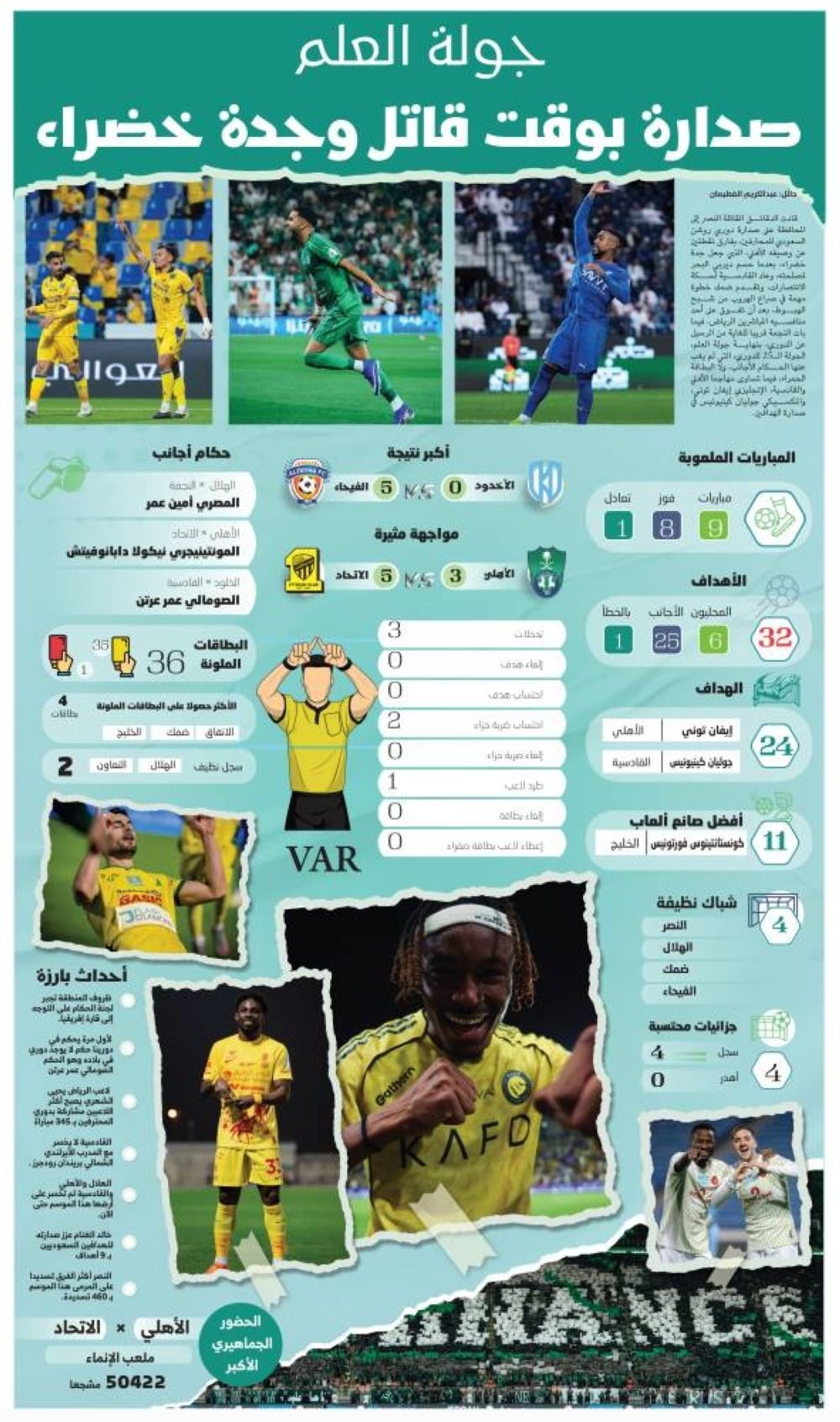 هذا الخبر يأتيكم برعاية موقع عيون الجزيرة الاخباري ويتمنى لكم قضاء وقت ممتع في قراة هذا الخبر قادت الدقائق القاتلة النصر إلى المحافظة على صدارة دوري روشن السعودي للمحترفين، بفارق نقطتين عن وصيفه الأهلي، الذي جعل جدة خضراء، بعدما حسم ديربي البحر لمصلحته، وعاد القادسية لسكة الانتصارات، وتقدم ضمك خطوة مهمة في صراع الهروب من شبح الهبوط، بعد أن تفوق على أحد منافسيه المباشرين الرياض، فيما بات النجمة قريبا للغاية من الرحيل عن الدوري، بنهاية جولة العلم، الجولة الـ25 للدوري، التي لم يغب عنها الحكام الأجانب، ولا البطاقة الحمراء، فيما تساوى مهاجما الأهلي والقادسية، الإنجليزي إيفان توني، والمكسيكي جوليان كينيونيس في صدارة الهدافين.