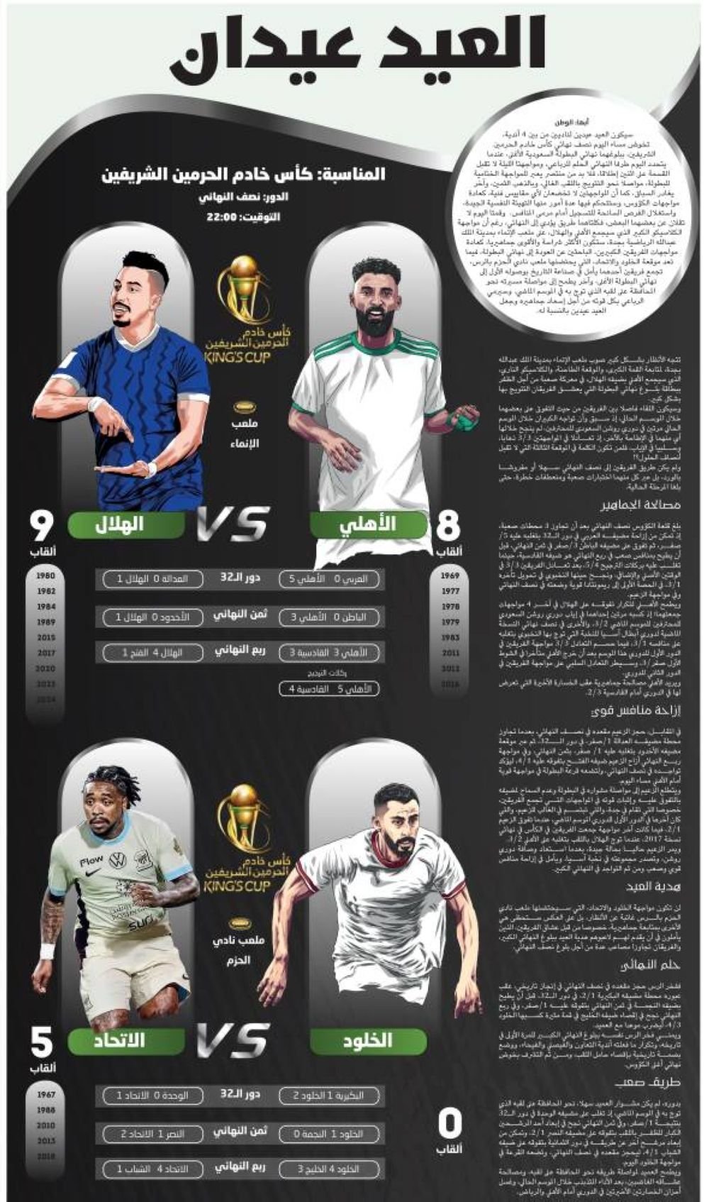 لن تكون مواجهة الخلود والاتحاد، التي سيحتضنها ملعب نادي الحزم بالرس غائبة عن الأنظار، بل على العكس ستحظى هي الأخرى بمتابعة جماهيرية، خصوصا من قبل عشاق الفريقين، الذين يأملون في أن يقدم لهم لاعبوهم هدية العيد ببلوغ النهائي الكبير، والفريقان تجاوزا مصاعب عدة من أجل بلوغ نصف النهائي.