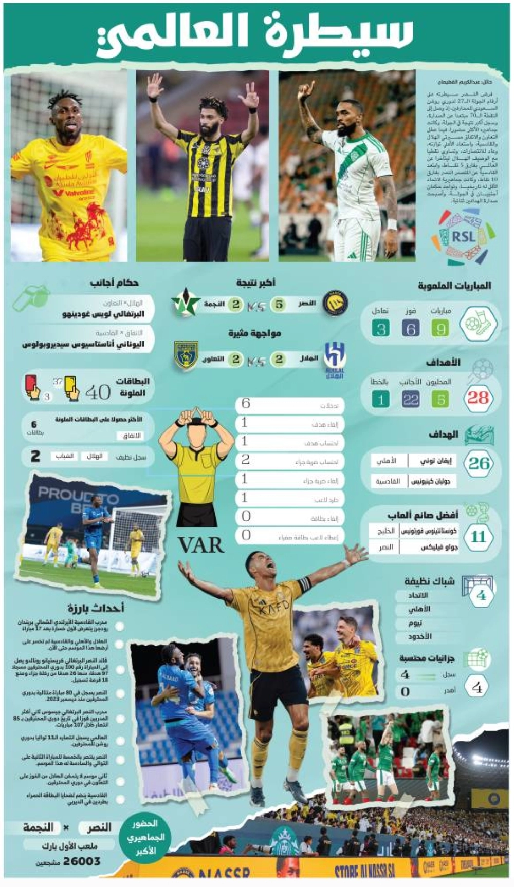 هذا الخبر يأتيكم برعاية موقع عيون الجزيرة الاخباري ويتمنى لكم قضاء وقت ممتع في قراة هذا الخبر فرض النصر سيطرته على أرقام الجولة الـ27 لدوري روشن السعودي للمحترفين، إذ وصل إلى النقطة الـ70 مبتعدا عن الصدارة، وسجل أكبر نتيجة في الجولة، وكانت جماهيره الأكثر حضورا، فيما عطل التعاون والاتفاق مسيرتي الهلال والقادسية، واستعاد الأهلي توازنه، وعاد للانتصارات، وتساوى نقطيا مع الوصيف الهلال ليتأخرا عن العالمي بفارق 5 نقاط، وابتعد القادسية عن المتصدر النصر بفارق 10 نقاط، وكانت جماهيرية الاتحاد الأقل له تاريخيا، وتواجد حكمان أجنبيان في الجولة، وأصبحت صدارة الهدافين ثنائية.