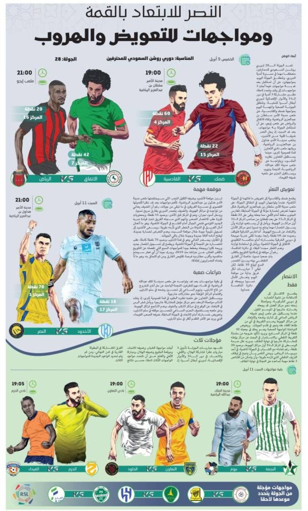 يطمح الاتفاق إلى الاستفادة من نشوة انتصاره في ديربي الشرقية، ومواصلة زحفه نحو مركز أفضل قد يجعله يشارك خارجيا في الموسم المقبل، عندما يستقبل على ملعب إيجو ضيفه الرياض الساعي إلى تدارك وضعه والابتعاد عن مراكز الهبوط وعدم التفريط في أي من نقاط اللقاء عله ينجو في قادم الجولات. ويخوض النواخذة المواجهة الصعبة وهو يملك في جعبته 42 نقطة في المركز السابع، ويريد تأكيد خروجه من سلسلة التفريط النقطي، والاستمرار في البحث عن مركز يؤهله للمشاركة خارجيا في نهاية المطاف. بدوره، ظل مدرسة الوسطى في المركز الـ16 أول مراكز الهبوط، برصيد 20 نقطة، رغم تعادله مع الشباب في الجولة الماضية، في أحد ديربيات الرياض، ويمني النفس بأن ينجح في إيقاف النزيف النقطي الذي لازمه طويلا، وأن يتمكن من اقتناص 3 نقاط مهمة تساعده على النجاة في نهاية المطاف.
