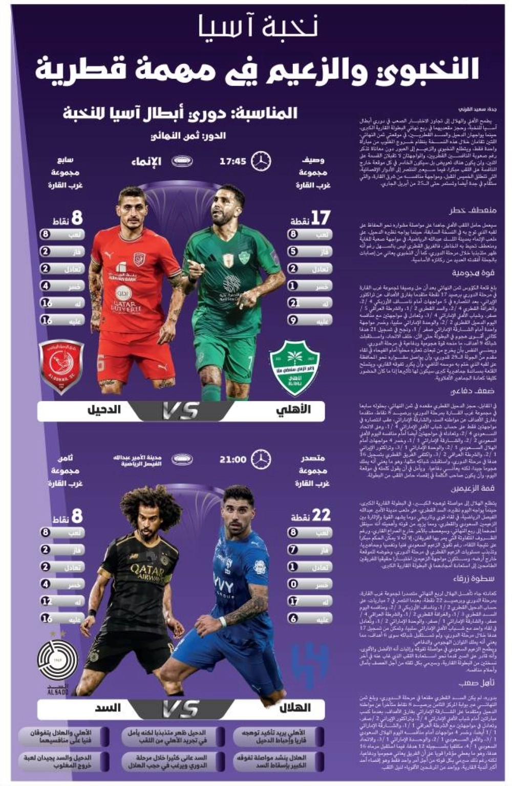 سيعمل حامل اللقب الأهلي جاهدا على مواصلة مشواره نحو الحفاظ على لقبه الذي توج به في النسخة السابقة، حينما يواجه نظيره الدحيل، على ملعب الإنماء بمدينة الملك عبدالله الرياضية، في مواجهة صعبة للغاية ومنعطف تحيط به المخاطر، فالفريق القطري ليس بالسهل رغم أنه ظهر متذبذبا خلال مرحلة الدوري، كما أن النخبوي يعاني من إصابات بالجملة أفقدته العديد من ركائزه الأساسية.