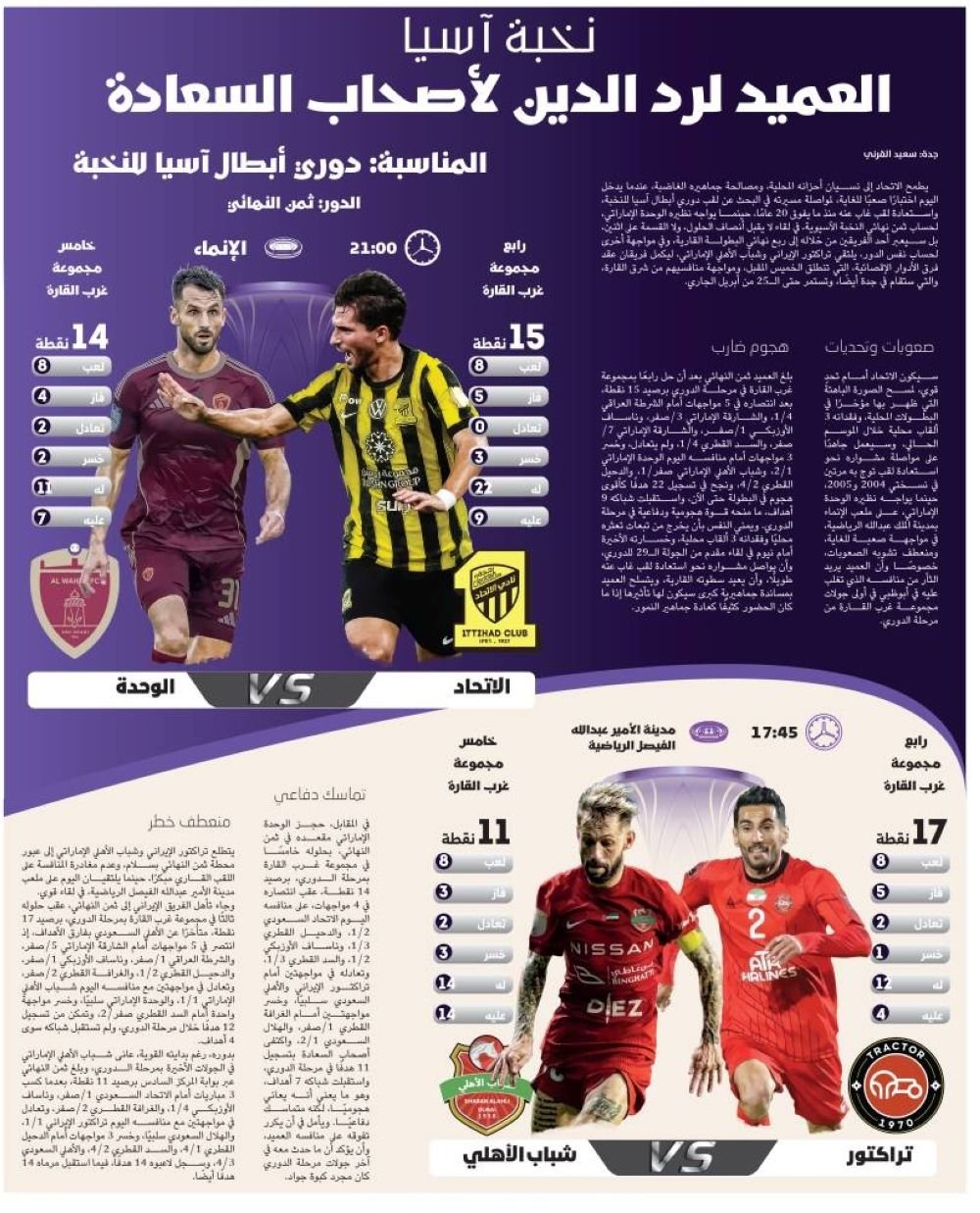 سيكون الاتحاد أمام تحدٍ قوي، لمسح الصورة الباهتة التي ظهر بها مؤخرًا في البطولات المحلية، وفقدانه 3 ألقاب محلية خلال الموسم الحالي، وسيعمل جاهدًا على مواصلة مشواره نحو استعادة لقب توج به مرتين في نسختي 2004 و2005، حينما يواجه نظيره الوحدة الإماراتي، على ملعب الإنماء بمدينة الملك عبدالله الرياضية، في مواجهة صعبة للغاية، ومنعطف تشوبه الصعوبات، خصوصًا وأن العميد يريد الثأر من منافسه الذي تغلب عليه في أبوظبي في أولى جولات مجموعة غرب القارة من مرحلة الدوري.