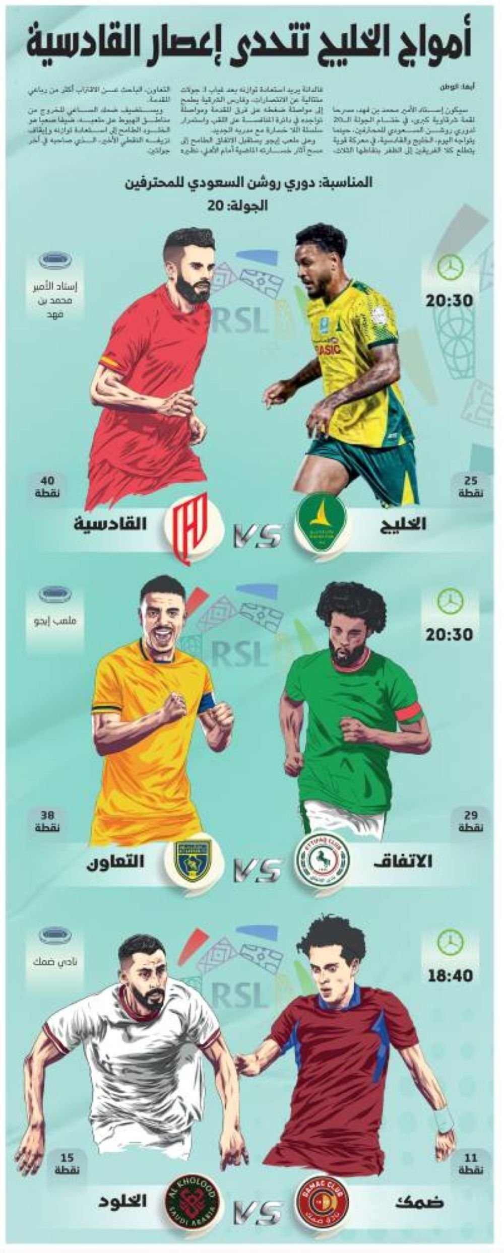 هذا الخبر يأتيكم برعاية موقع عيون الجزيرة الاخباري ويتمنى لكم قضاء وقت ممتع في قراة هذا الخبر سيكون إستاد الأمير محمد بن فهد، مسرحا لقمة شرقاوية كبرى، في ختام الجولة الـ20 لدوري روشن السعودي للمحترفين، حينما يتواجه اليوم، الخليج والقادسية، في معركة قوية يتطلع كلا الفريقين إلى الظفر بنقاطها الثلاث، فالدانة يريد استعادة توازنه بعد غياب 3 جولات متتالية عن الانتصارات، وفارس الشرقية يطمح إلى مواصلة ضغطه على فرق المقدمة ومواصلة تواجده في دائرة المنافسة على اللقب واستمرار سلسلة اللا خسارة مع مدربه الجديد.