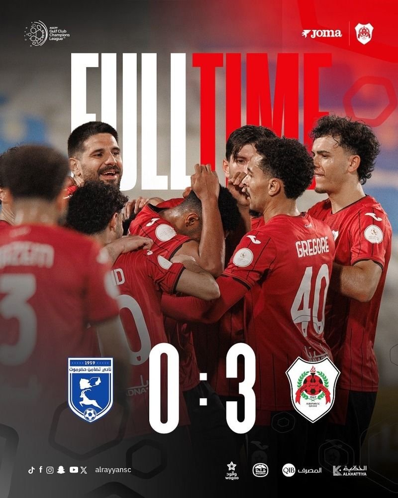 ورفع الريان رصيده إلى النقطة التاسعة في صدارة المجموعة حاسما تأهله رسميا إلى الدور قبل النهائي بغض النظر عن المواجهة الأخيرة أمام النهضة العماني ثاني الترتيب بسبع نقاط، والمقررة يوم 17 الشهر الجاري، فيما تجمد رصيد تضامن حضرموت عند أربع نقاط في المركز الأخير متأخرا بفارق الأهداف عن الشباب السعودي صاحب الرصيد نفسه.