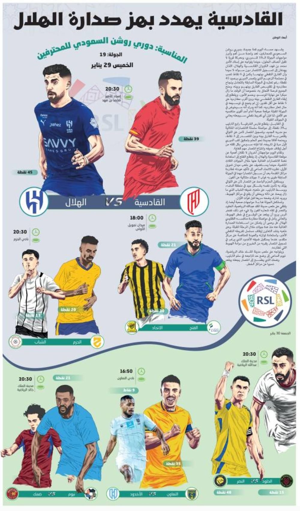 وتستكمل الجولة غدا بـ3 مواجهات صعبة أيضا، إذ يلتقي على ملعب مدينة الملك عبدالله الرياضية، الخلود والنصر في لقاء شعاره الفوز ولا شيء غير ذلك، ففخر الرس يريد أن يبتعد عن الوقوع في خطر الهبوط، والعالمي يأمل في مواصلة مطاردة منافسه التقليدي الهلال عل وعسى أن يتمكن من استعادة الصدارة الغائبة عنه منذ عدة جولات خلال المرحلة المقبلة. وعلى ملعبه ينشد التعاون إيقاف مسلسل تفريطه النقطي الأخير، واستعادة توازنه والعودة للمنافسة على مركز متقدم، عندما يستقبل ضيفه الأخدود الذي يرغب في تسجيل انتصار يقربه من الخروج من دوامة الهبوط التي تطارده.