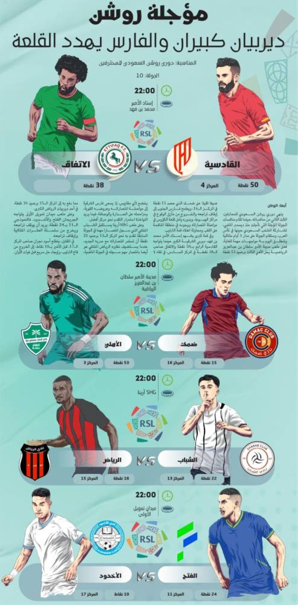 وفي قمة كبرى يشهد إستاد اﻷمير محمد بن فهد، ديربي الشرقية الكبير حينما يتواجه القادسية الرابع بـ50 نقطة والاتفاق صاحب الـ38 نقطة في المركز السادس، في لقاء لا يخضع ﻷي مقاييس، إذ يسعى فارس الشرقية إلى مواصلة انتصاراته وعروضه القوية، ومزاحمته على الصدارة والوصافة، فيما يريد النواخذة استمرار التقدم نحو مركز أفضل.