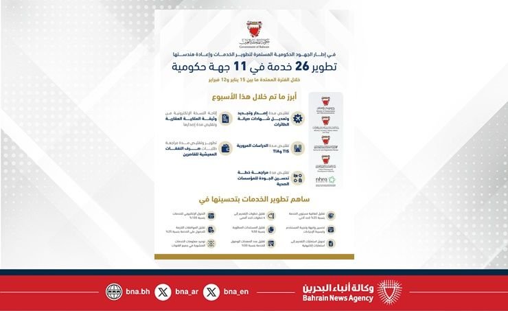 هذا الخبر يأتيكم برعاية موقع عيون الجزيرة الاخباري ويتمنى لكم قضاء وقت ممتع في قراة هذا الخبر المنامة في 12 فبراير/ بنا / في إطار الجهود الحكومية المستمرة لتطوير الخدمات وإعادة هندستها، تم خلال الفترة الممتدة ما بين 15 يناير و12 فبراير تطوير 26 خدمة في 11 جهة حكومية، في خطوة تجسد الحرص المستمر على تطوير جودة الخدمات الحكومية وتسريع وتيرة إنجازها، بما يعزز كفاءة العمل المؤسسي ويرتقي بتجربة المستفيدين.