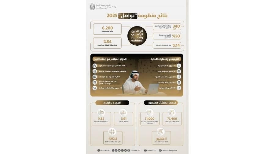 نفذت وزارة الموارد البشرية والتوطين أكثر من 60 مليون عملية تواصل مع متعامليها عبر منظومة «تواصل» خلال عام 2025، في مؤشر يعكس مخرجات الحوكمة الرقمية وفاعليتها في تطوير التواصل مع المتعاملين، وتنوع الخدمات المقدمة عبر المنظومة، بما يعزز من كفاءة تجربة المتلقين للخدمة وسعادتهم ويدعم في الوقت ذاته ريادة الخدمات والتحول الرقمي والذكاء الاصطناعي في الدولة ومسيرة تصفير البيروقراطية.