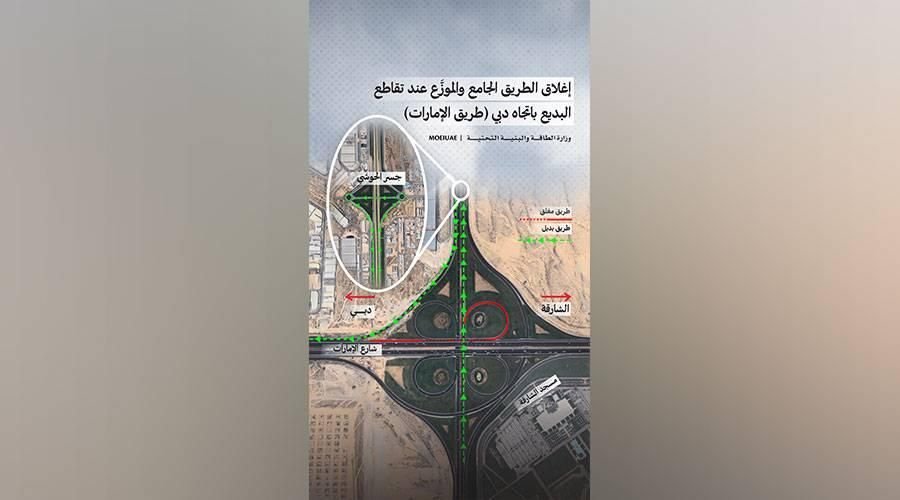 أعلنت وزارة الطاقة والبنية التحتية أنه سيتم إغلاق طريق الجامع والموزّع عند تقاطع البديع باتجاه دبي (طريق الإمارات)، وتحويل حركة المرور إلى جسر الحوشي على طريق مليحة- الاتجاه الغربي، وذلك ضمن الأعمال التطويرية في المنطقة.