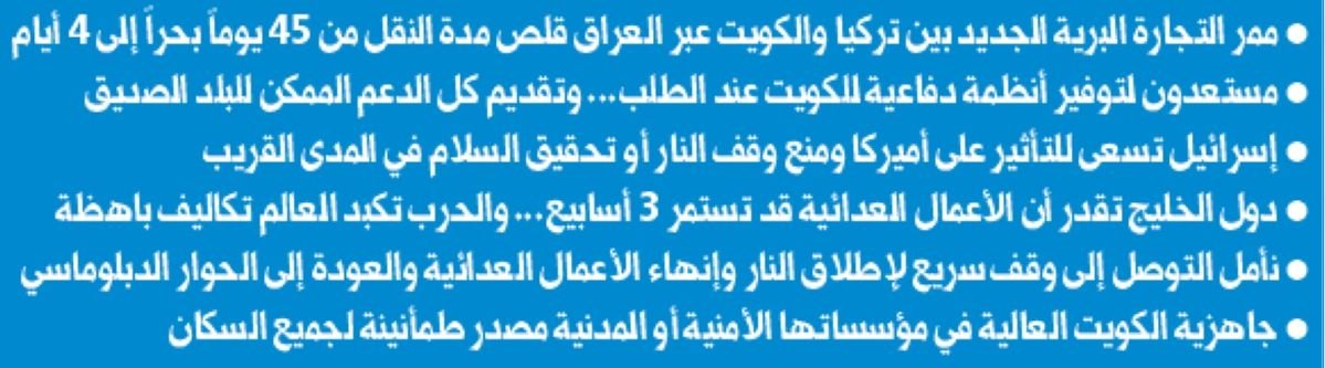 - نشيد بشدة بالتعامل الكويتي المتزن والمهني والمؤسسي مع الهجمات الإيرانية، وقد أظهرت قوات الأمن والدفاع الكويتية فعالية ملحوظة في اعتراض الصواريخ والطائرات المسيّرة وتحييدها، فقد تمكنت حتى الآن من تحييد ما يقارب 300 صاروخ بالستي وأكثر من 500 طائرة مسيّرة، ويعكس هذا مستوى عالياً من الجاهزية والتنسيق العملياتي.