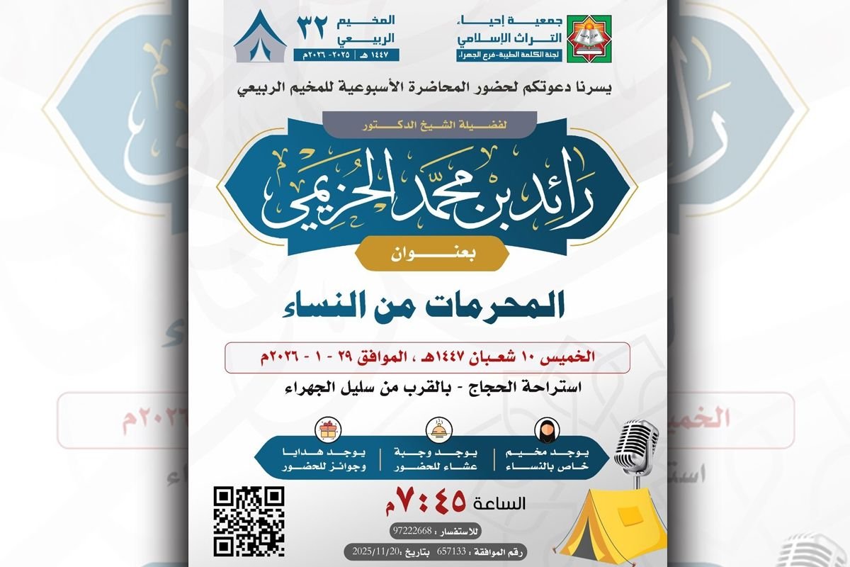 هذا الخبر يأتيكم برعاية موقع عيون الجزيرة الاخباري ويتمنى لكم قضاء وقت ممتع في قراة هذا الخبر تنظم جمعية إحياء التراث الإسلامي، محاضرة عامة بعنوان «المحرمات من النساء» يحاضر فيها الداعية رائد الحزيمي، وذلك في تمام الساعة 7:40 من مساء الغد في المخيم الربيعي 32 المقام في استراحة الحجاج بالقرب من سليل في الجهراء.